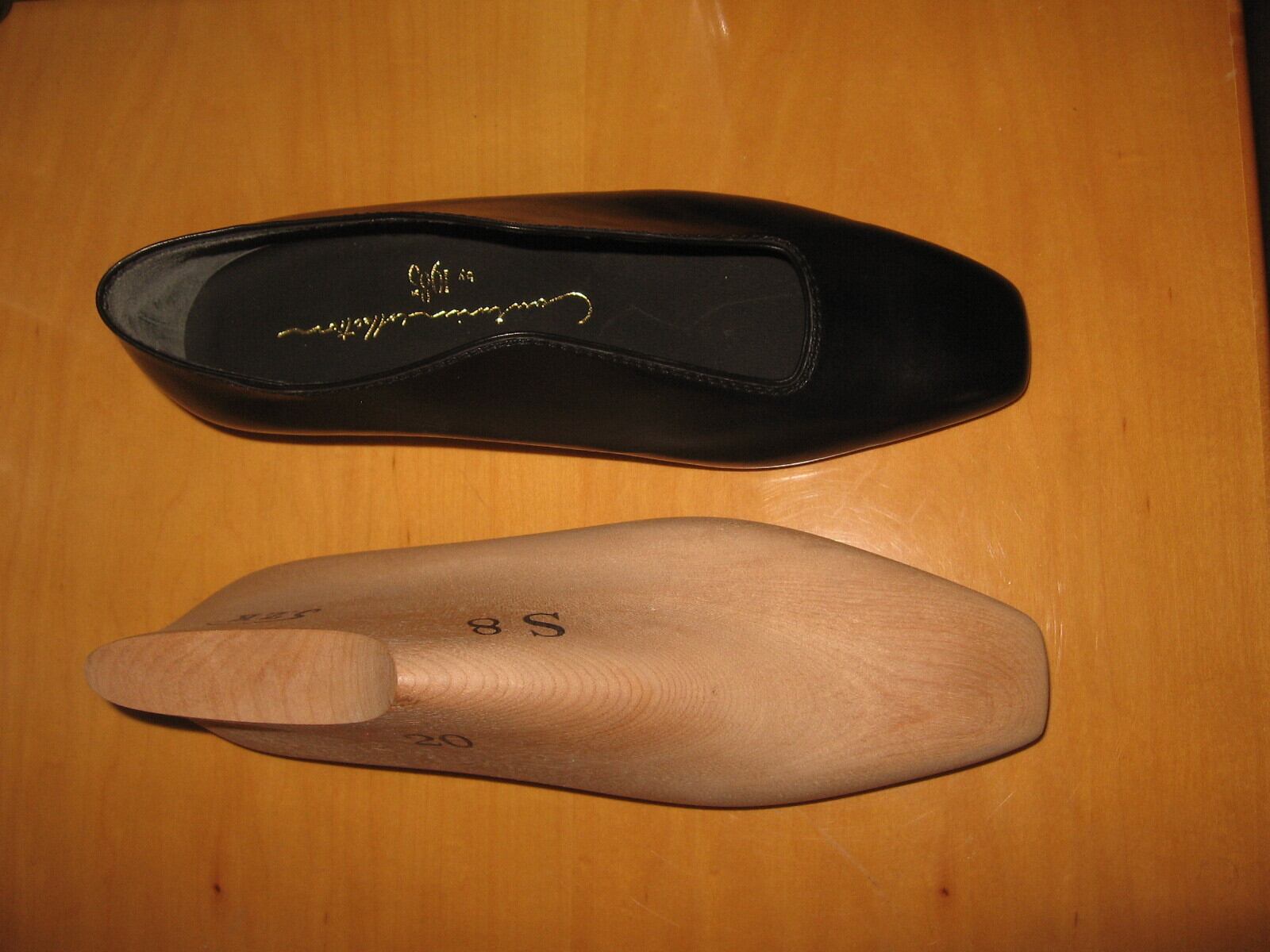 1980年代後半にショールームの展示用に製造されたサイドのカットが印象的なスクエアレディースパンプスとその靴を作製した靴木型で、左足のみの1点ものです。ヒールの高さは2センチ。サイズは23。
